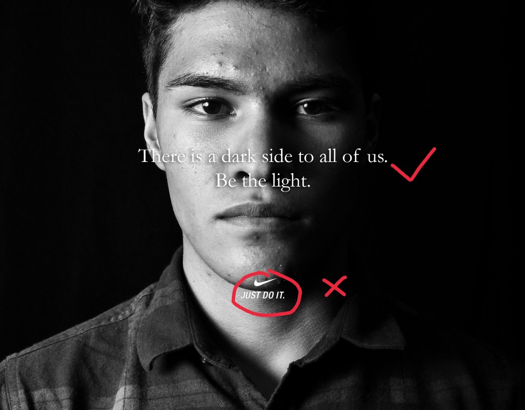 Lastly we have typography. Nike went with a simple, but serious text that looks like Times New Roman or a similar old style serif font. It portrays the message well and effectively. The centered text also gives it a more serious look.